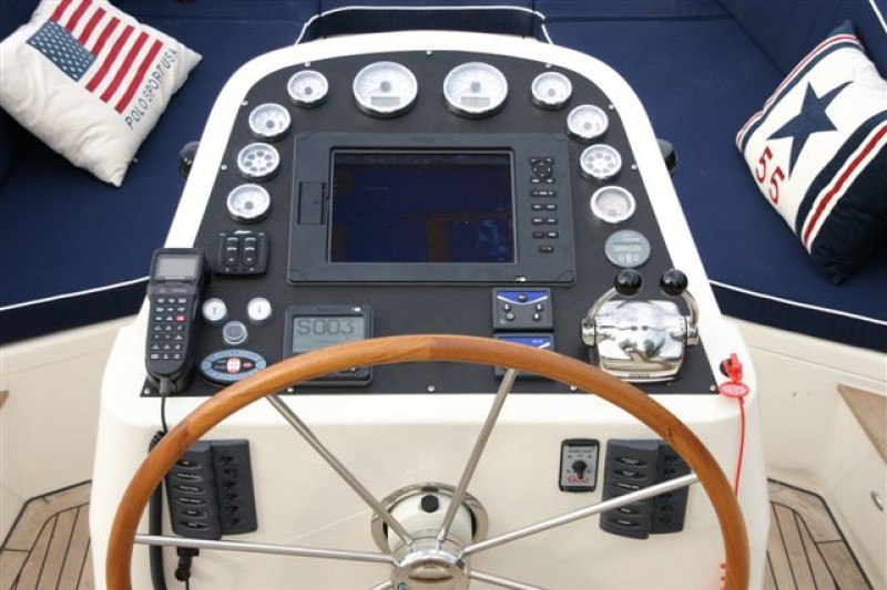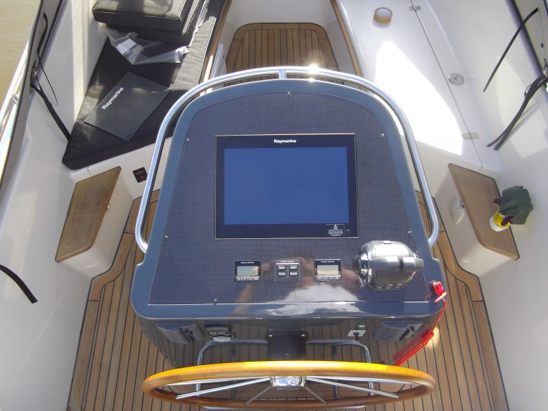 Bei niedriger Tourenzahl bleibt der Tender gut auf Kurs und ist auch dann einfach zu manövrieren. In der geräumigen offenen Kajüte bietet eine bequeme Bank Platz an acht Personen. In der Steuerkabine ist eine Toilette eingebaut und die u-förmigen Sitzbänke verfügen über viel Stauraum. Man könnte hier sogar einen Kühlschrank einbauen.